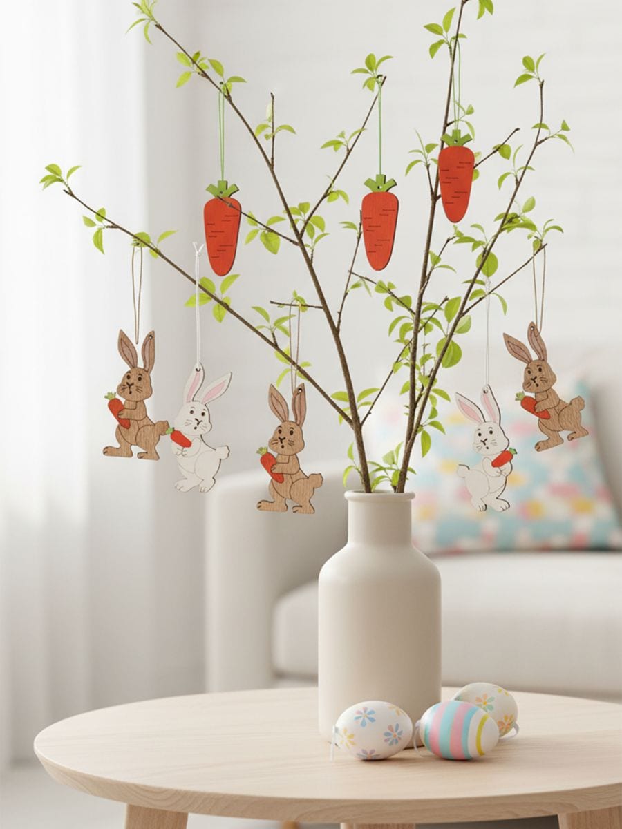 Set drvenih uskrsnih visećih ukrasa sa zečevima i mrkvama 12 pack