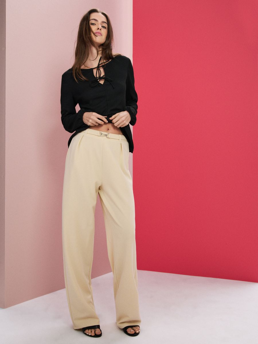 Wide leg pantalone sa naborima i dekorativnim kaišem