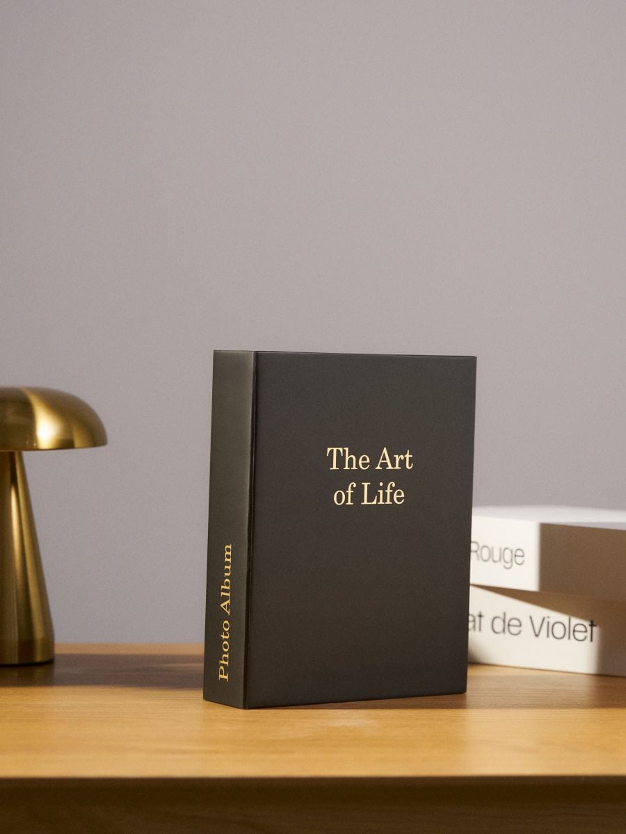 Fotoalbum se zlatým nápisem "Our Life in Pictures"