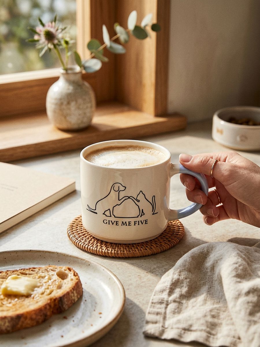 Becher mit Druck von einem Hund und einer Katze