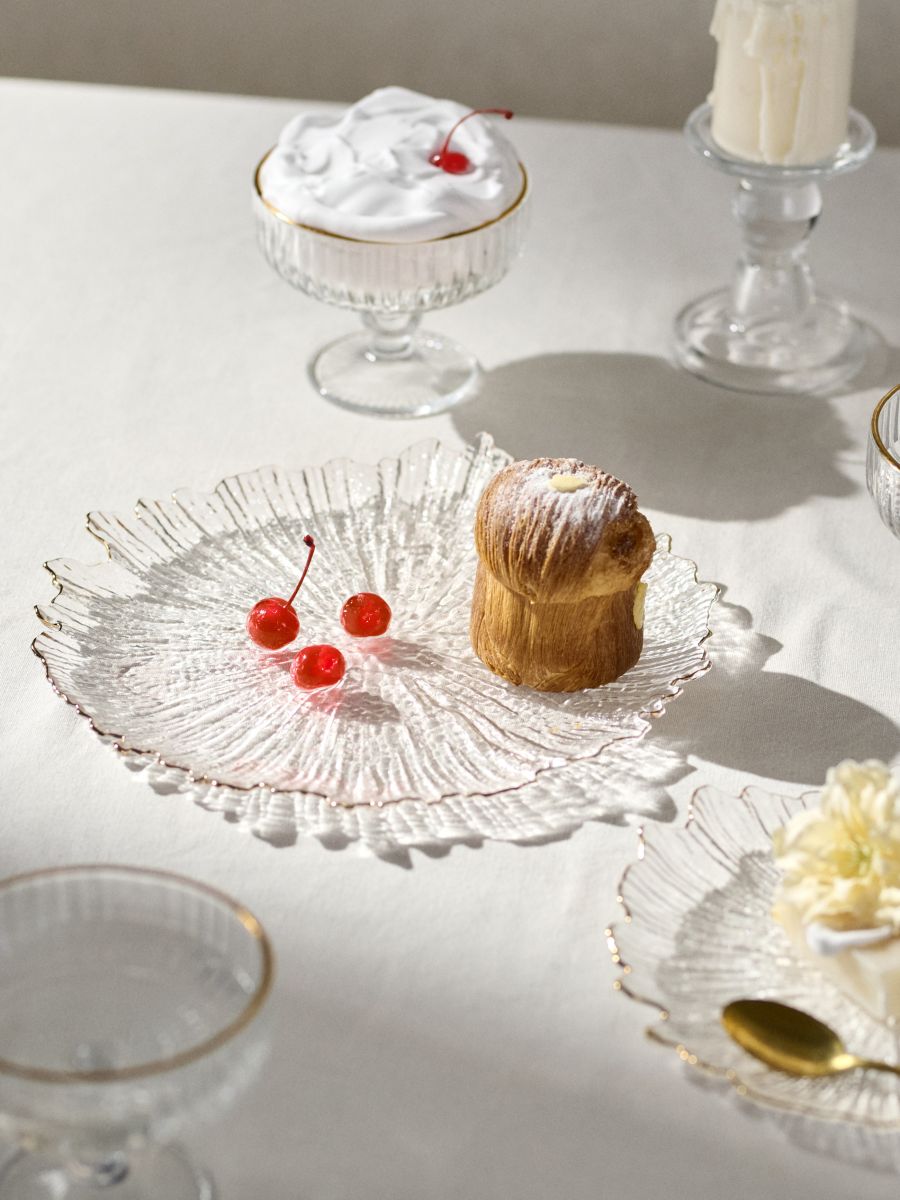 Dekoratiivne klaasist serveerimisvaagen tekstuuriga ja kuldse servaga