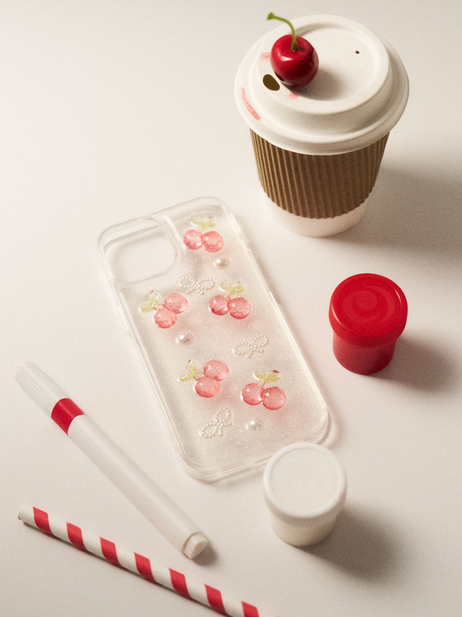 iPhone 15 ümbris kirsi- ja lipsumotiiviga