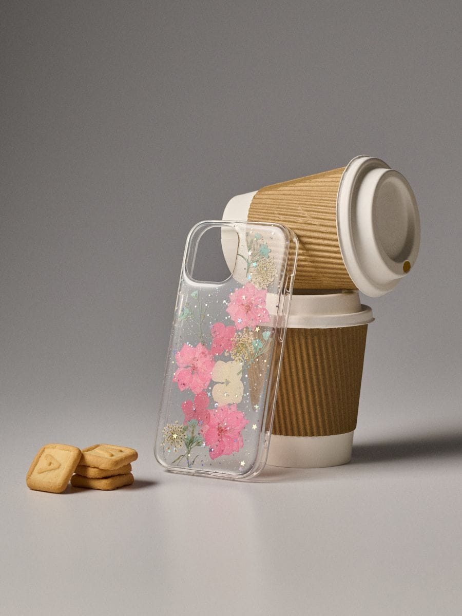 iPhone 15 ümbris kuivatatud lillede ja sädelusega