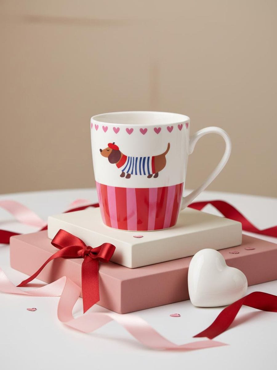 Keraamiline kruus taksikoeraga kampsunis ja südamekestega