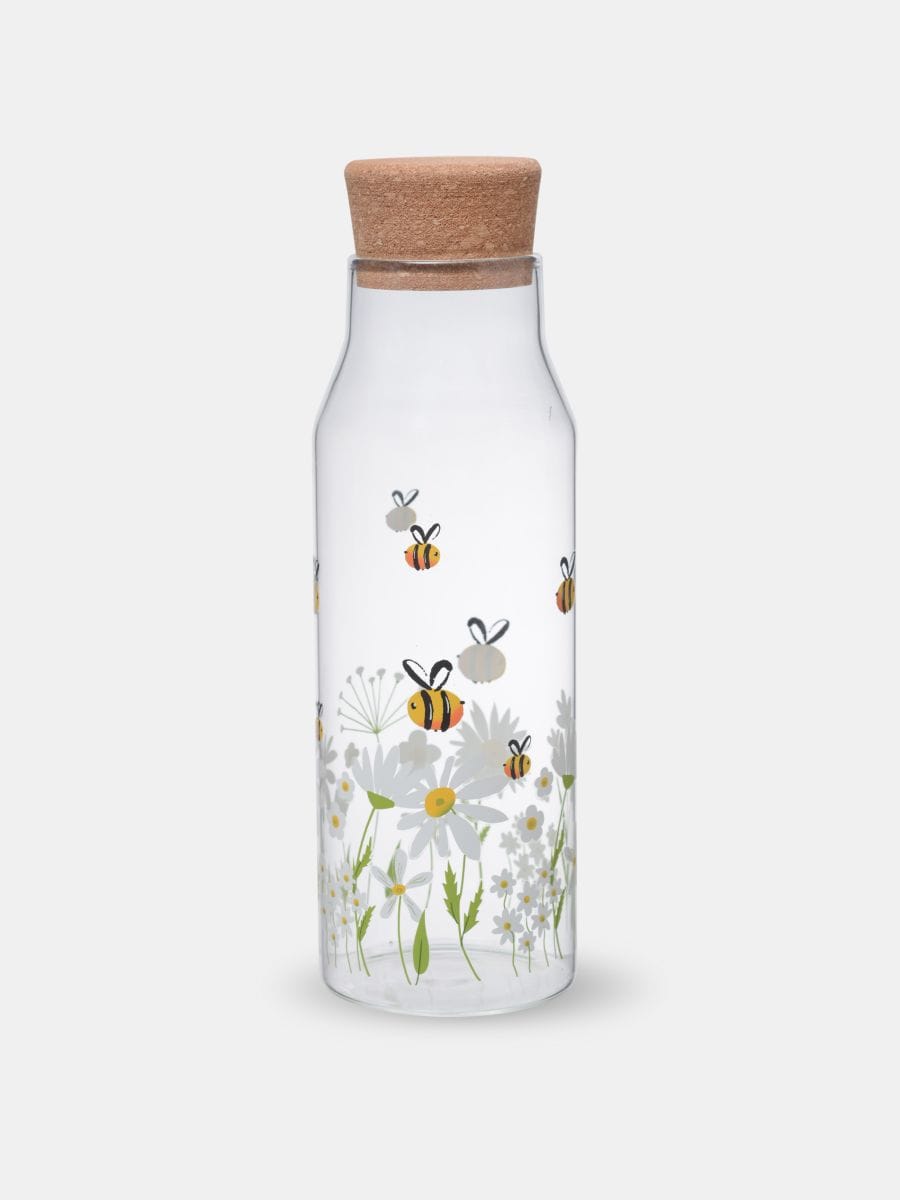 Klaasist karahvin korgiga lille- ja mesilasmustriga