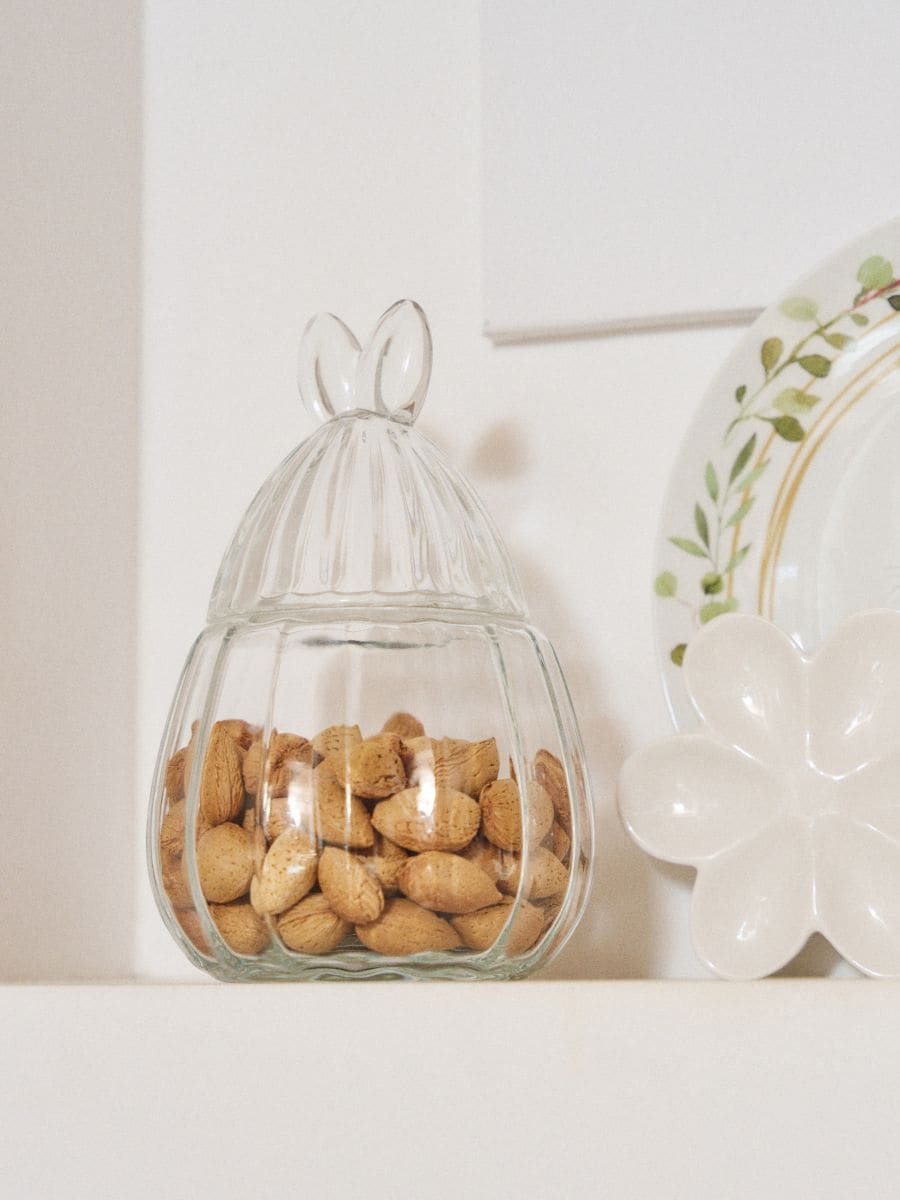 Klaasist toiduhoidik kaanega, millel on jänkumuster
