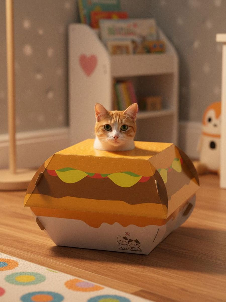 Kokkupandav papist kassimaja burgeri kujuga, kraapimisalusega sees
