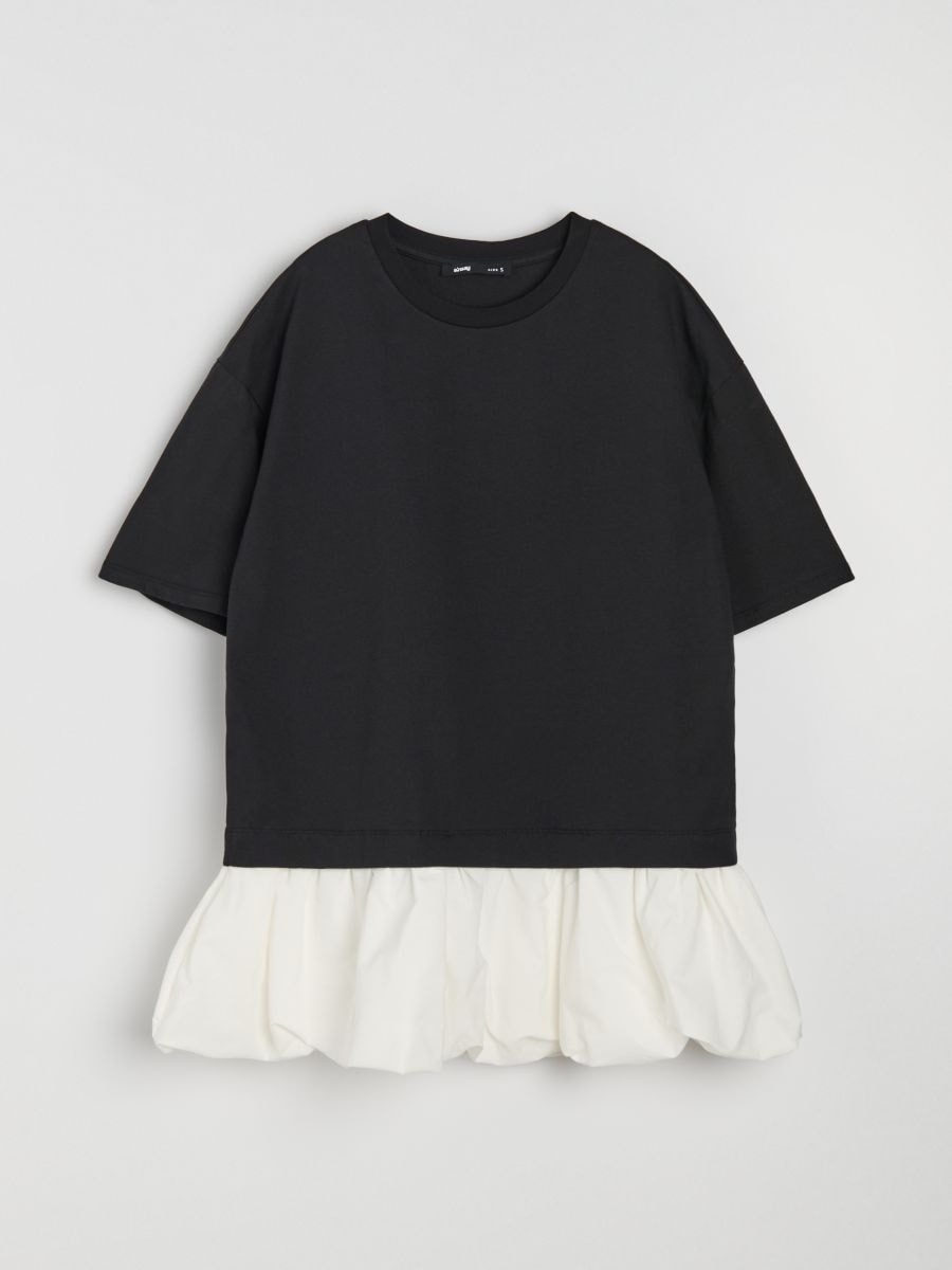 Lühikeste varrukatega puuvillane pluus kontrastse volangiga allääres