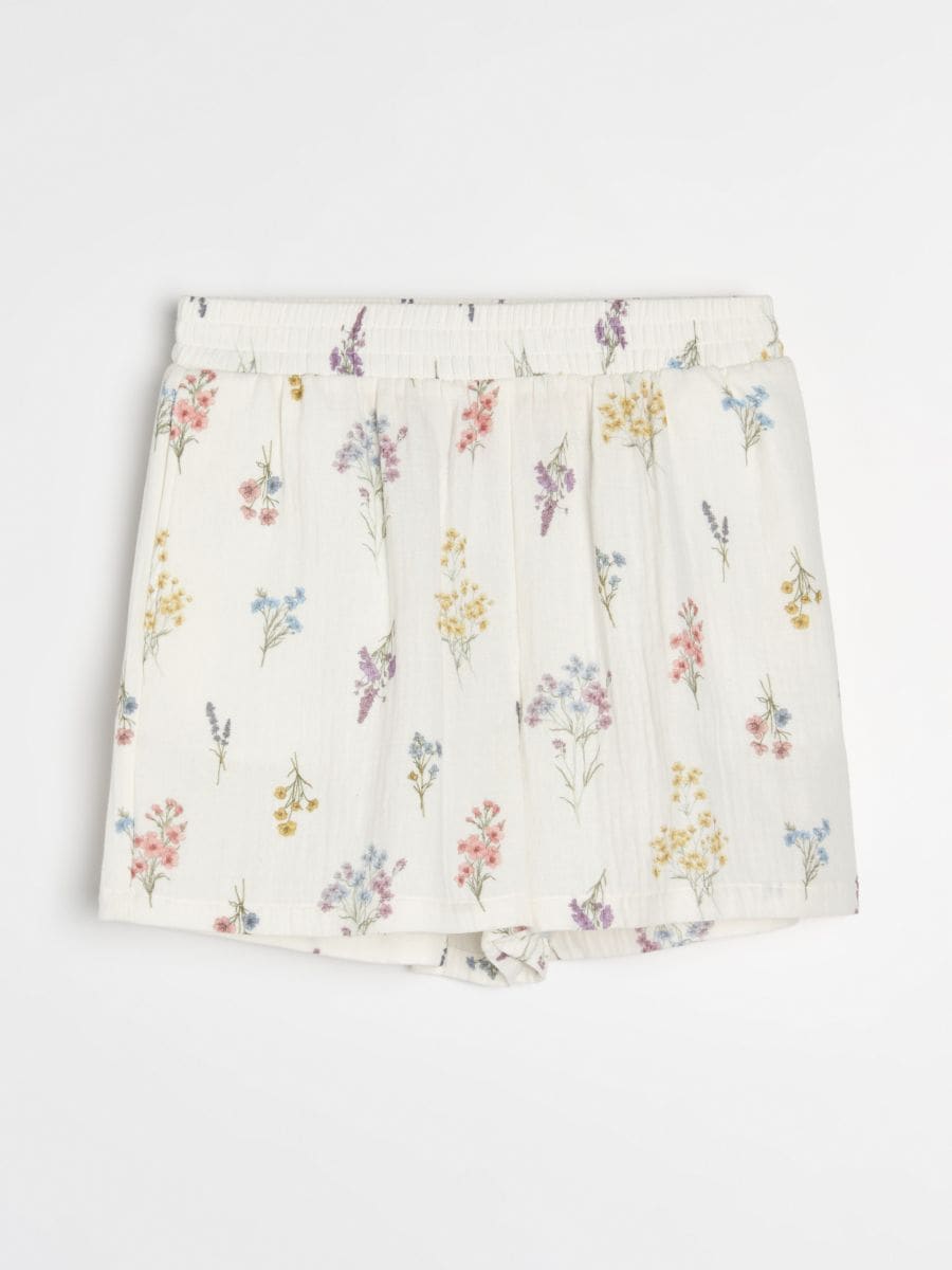Musliinist lühikesed püksid taskutega lillelise mustriga