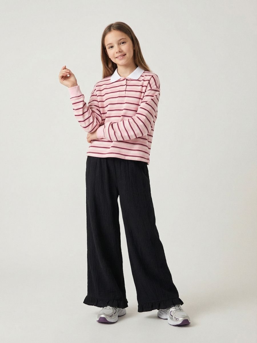 Musliinkangast püksid elastse vöökoha ja volangidega