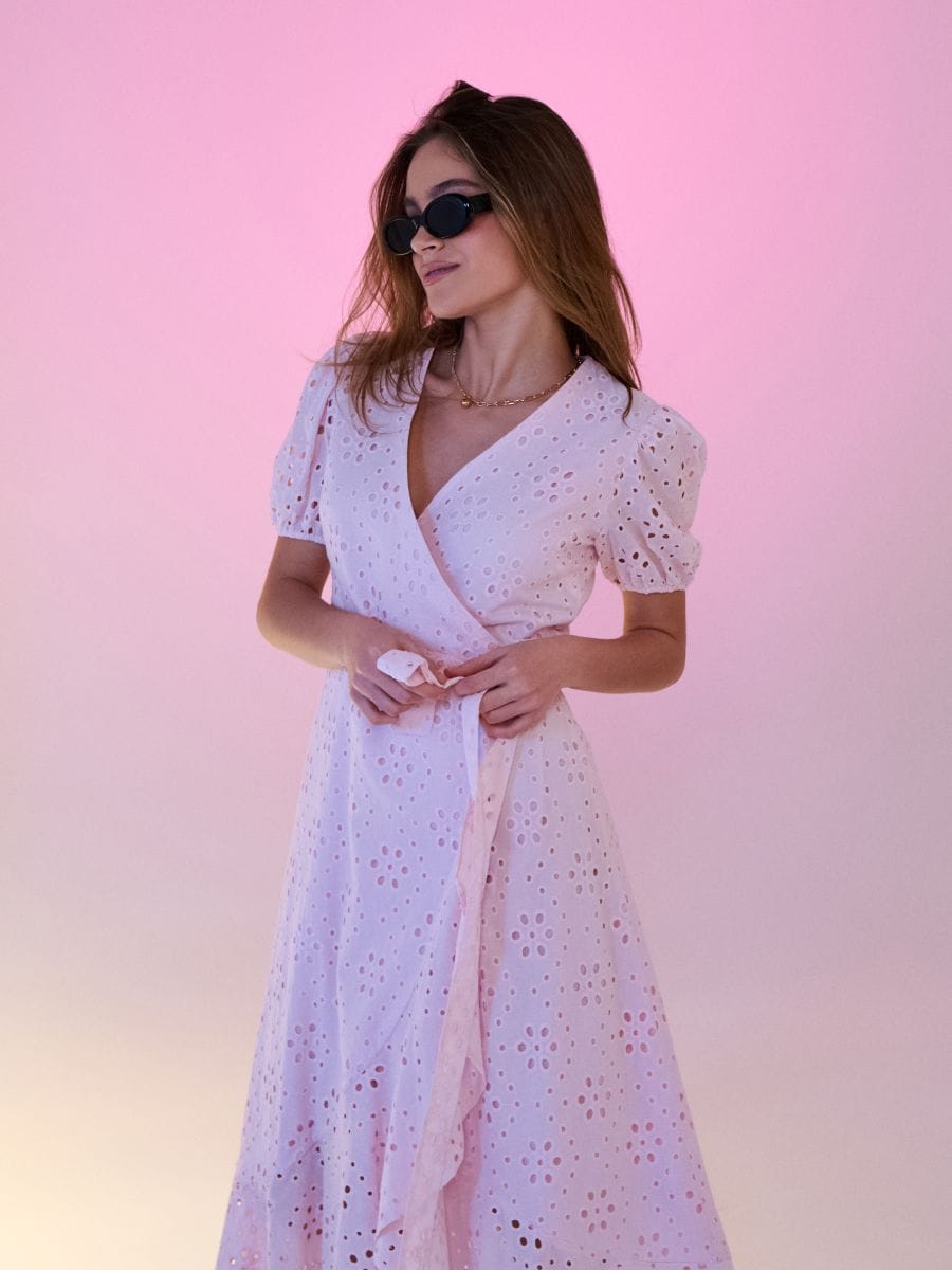 Puuvillane ažuurse mustriga midi-kleit volangi ja paelaga