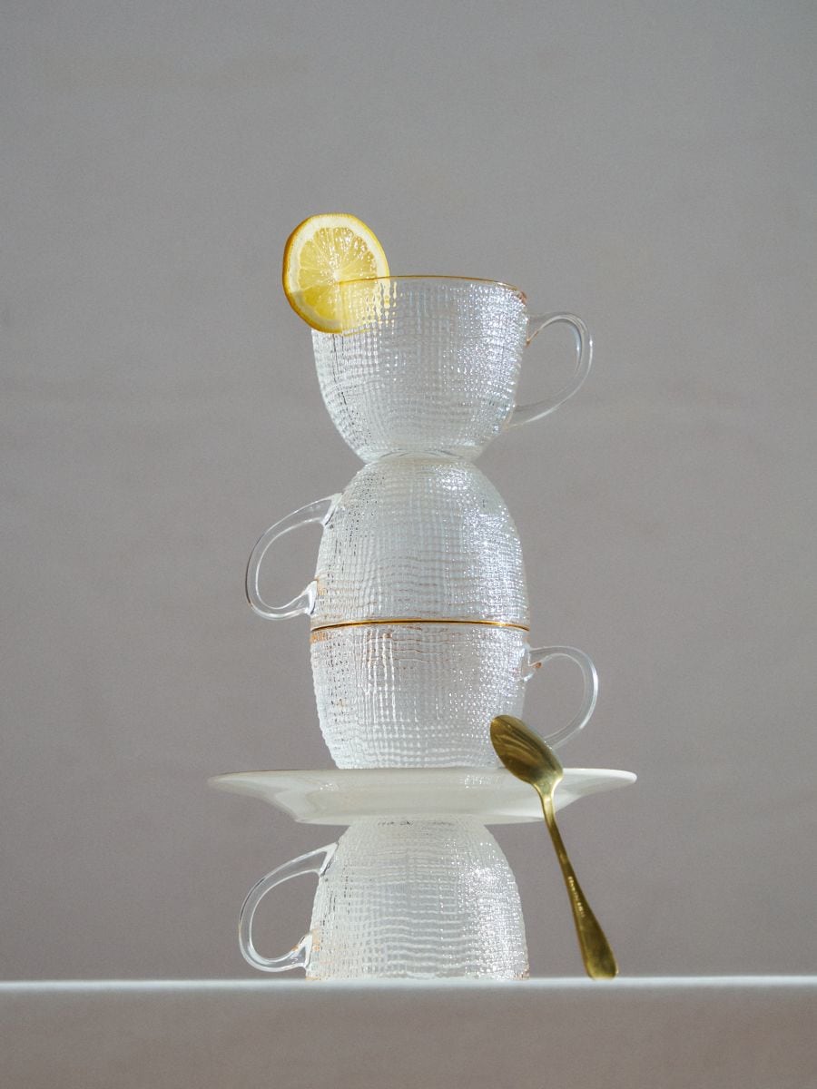 Reljeefse mustriga klaaskruuside komplekt kuldse servaga 4 pack