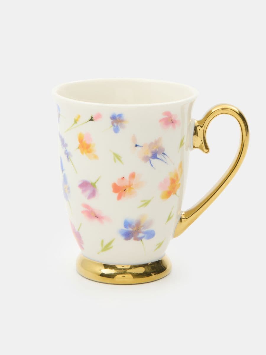 Tass lilletrükiga ja kuldsete detailidega