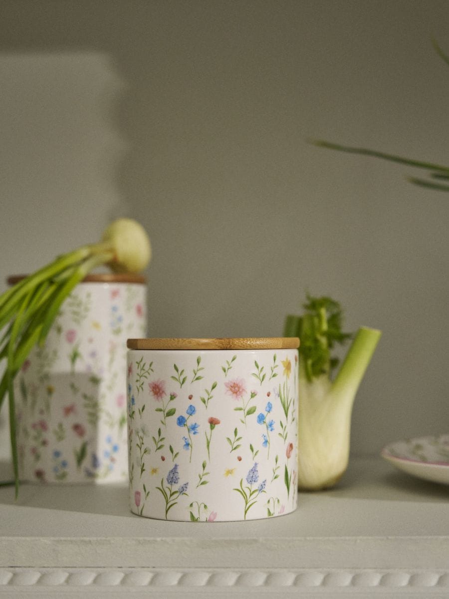 Toidunõu kaanega ja lillemustriga