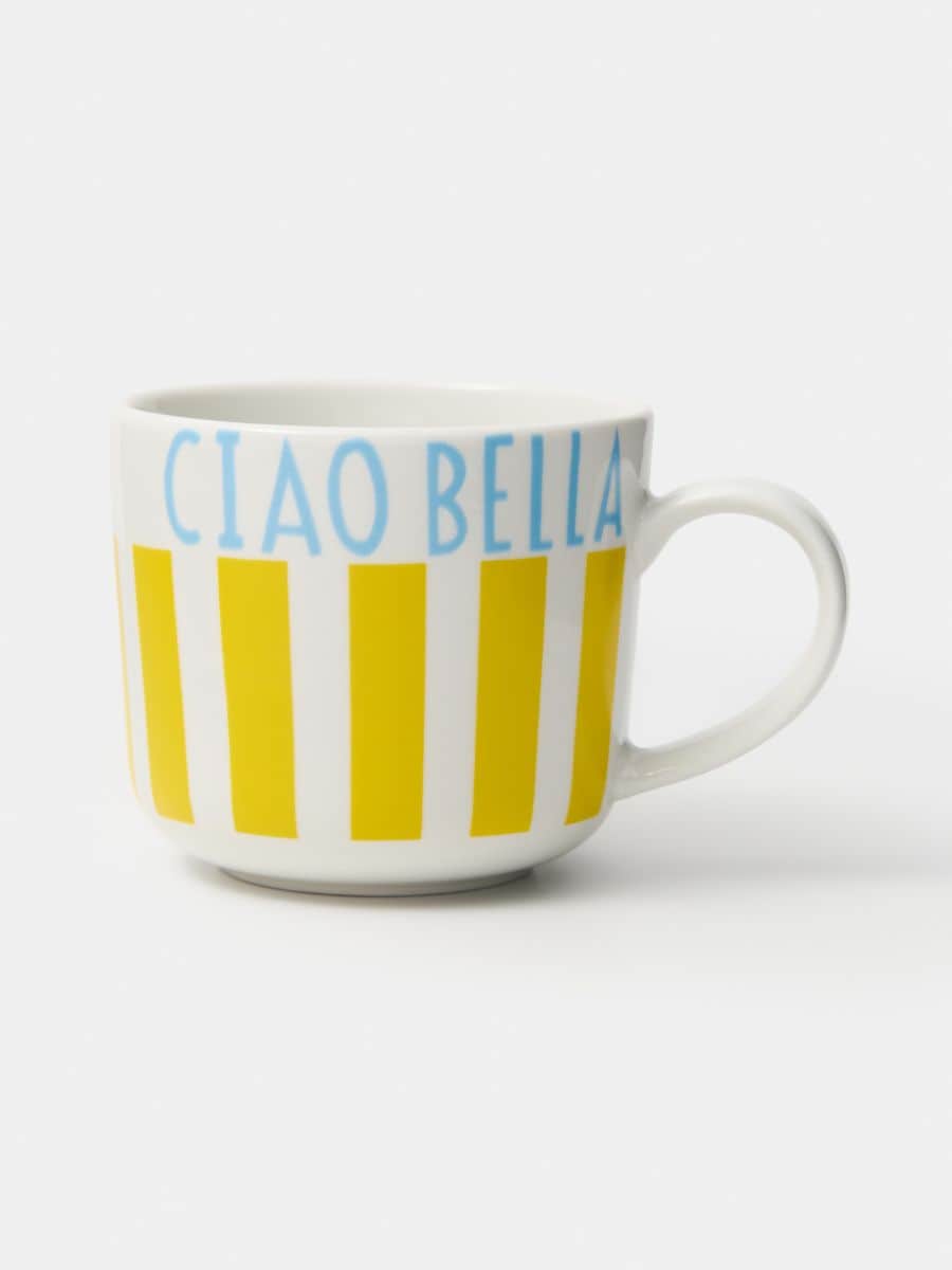 Triibuline keraamiline kruus kirjaga „Ciao bella“