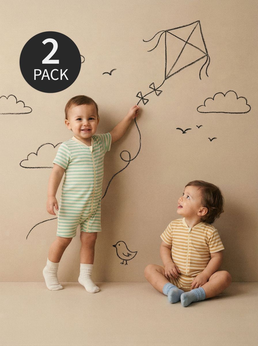Triibulised puuvillased romperid loomaplekkidega 2 tk komplekt