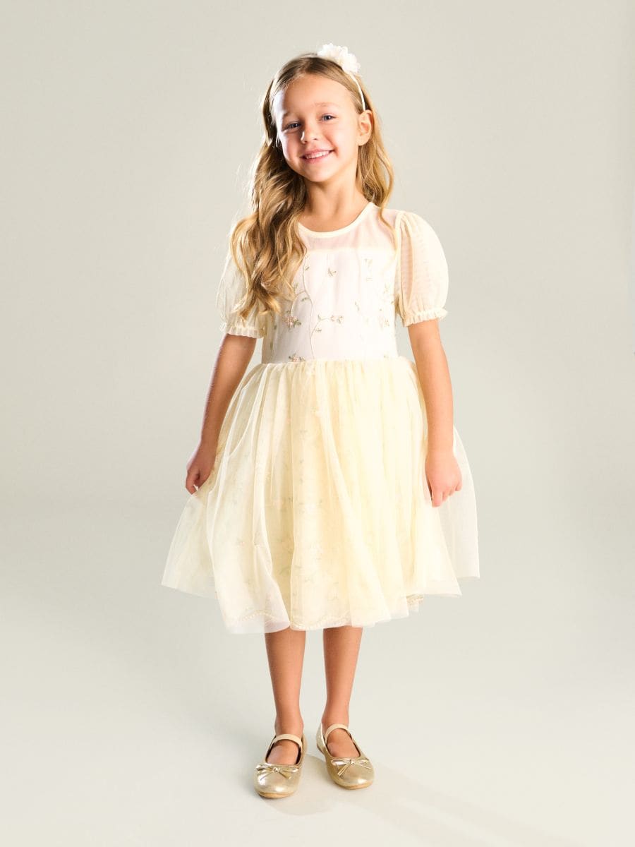 Tüllist babydoll-lõikega kleit tikitud mustriga