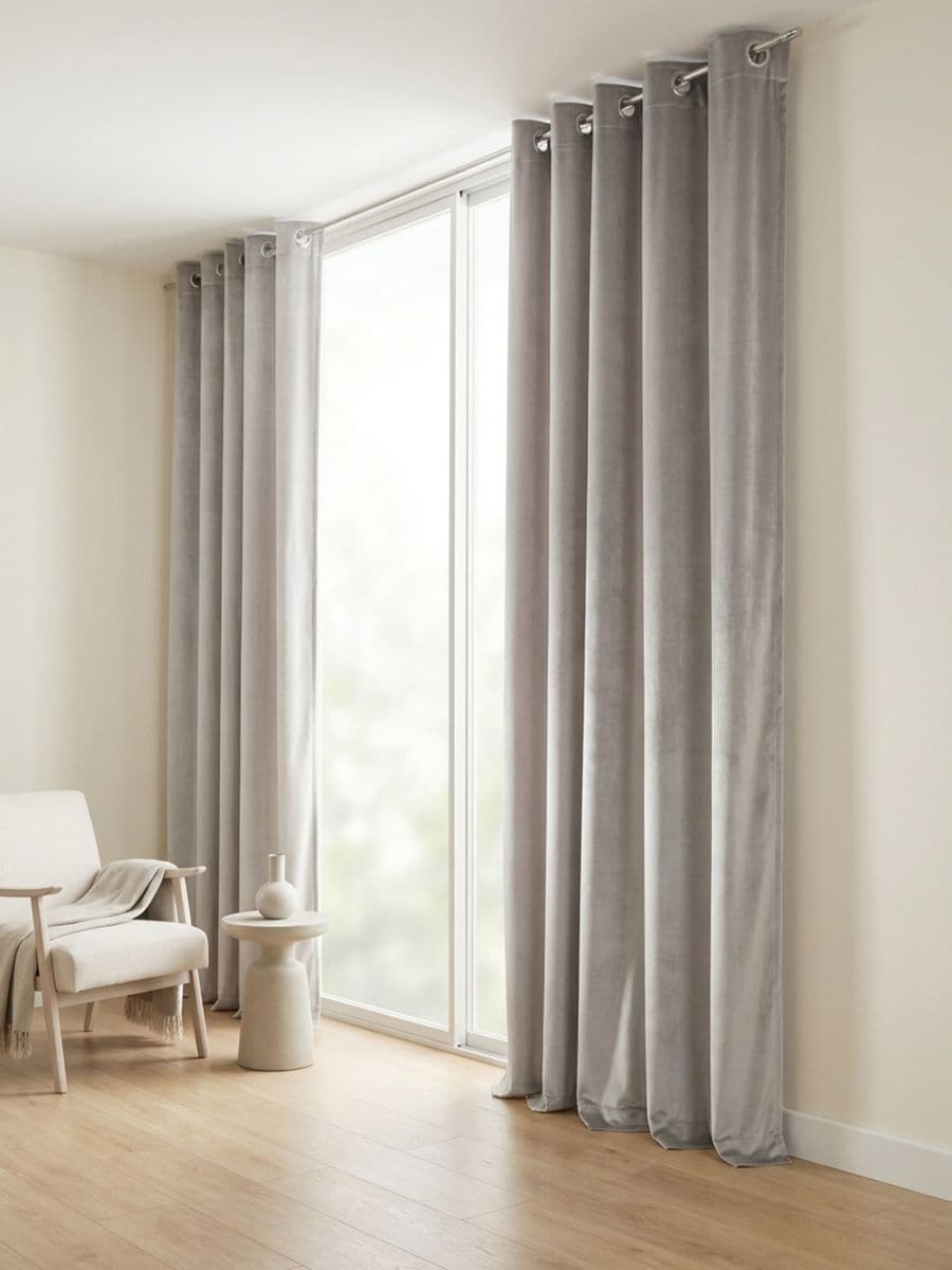 Ühevärviline kardin rõngastega ja veluurse viimistlusega