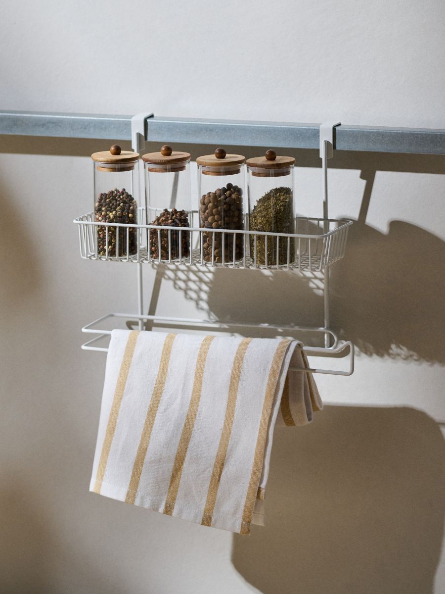Uksele kinnitatav köögi korraldaja korvi ja rätikuhoidjaga