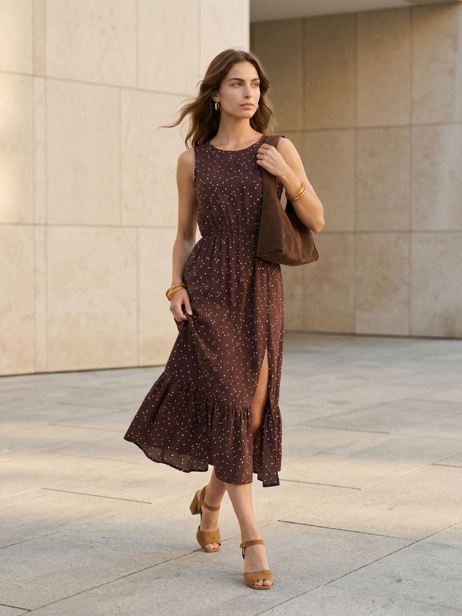Μίντι φόρεμα από βισκόζη με πουά και βολάν