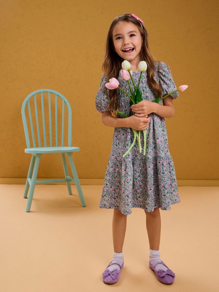 Φόρεμα με μικρά λουλούδια, σούρα στο επάνω μέρος και φουσκωτά μανίκια
