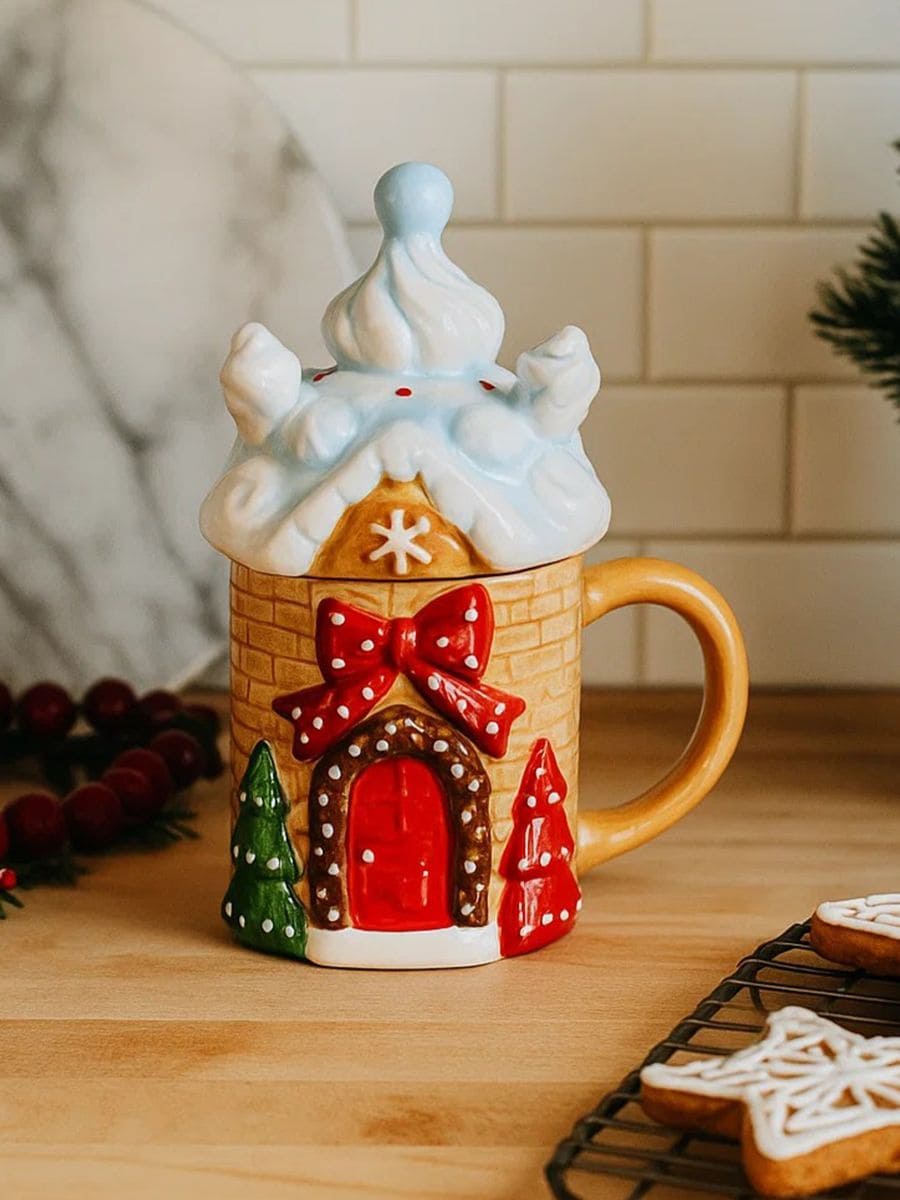 Karácsonyi bögre mézeskalács ház formában, fedéllel