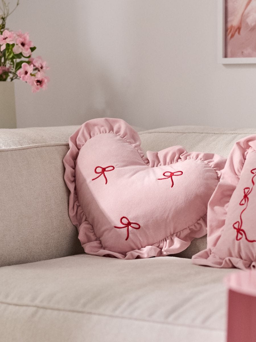 Dekoratīvs sirds formas spilvens ar volānu un izšūtām bantītēm