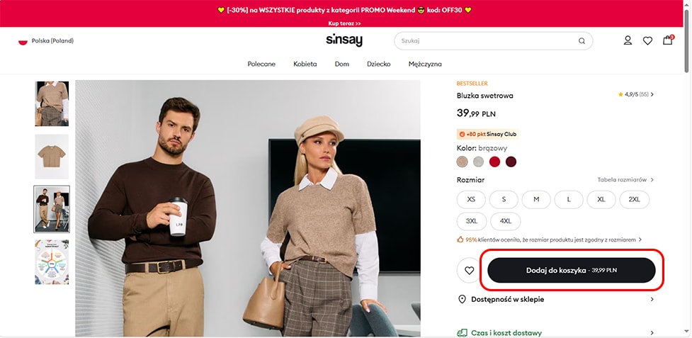 2. Po wybraniu odpowiedniego rozmiaru (możesz sprawdzić wymiary każdego produktu klikając na link "tabela rozmiarów") możesz dodać produkt do koszyka. Do koszyka możesz dodać tylko rozmiary dostępne. Te, których aktualnie nie ma w sprzedaży internetowej (w liście rozmiarów mają kolor szary) możesz obserwować, klikając na „Powiadom mnie”. Będąc na stronie produktu masz również możliwość sprawdzenia dostępności interesującego Cię rozmiaru w wybranym sklepie Sinsay w Polsce.