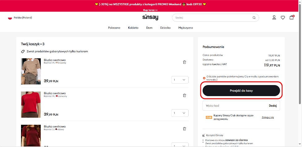 4. Kliknięcie ikony "koszyka" w prawym górnym rogu LUB kliknięcie "Przejdź do koszyka" na stronie produktu przeniesie Cię do pełnego widoku koszyka, w którym możesz zmienić liczbę sztuk.