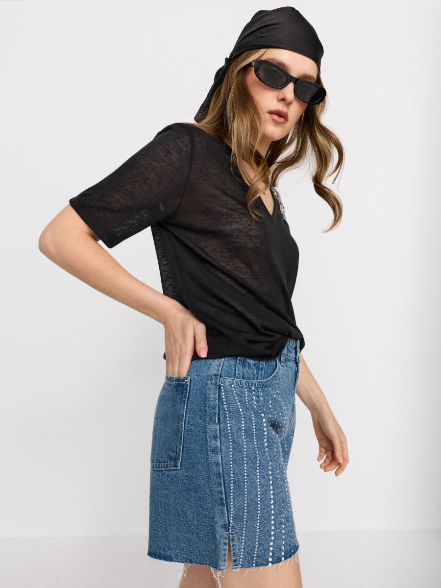Koszulka z dekoltem V z ozdobną aplikacją na ramieniu z wiskozą