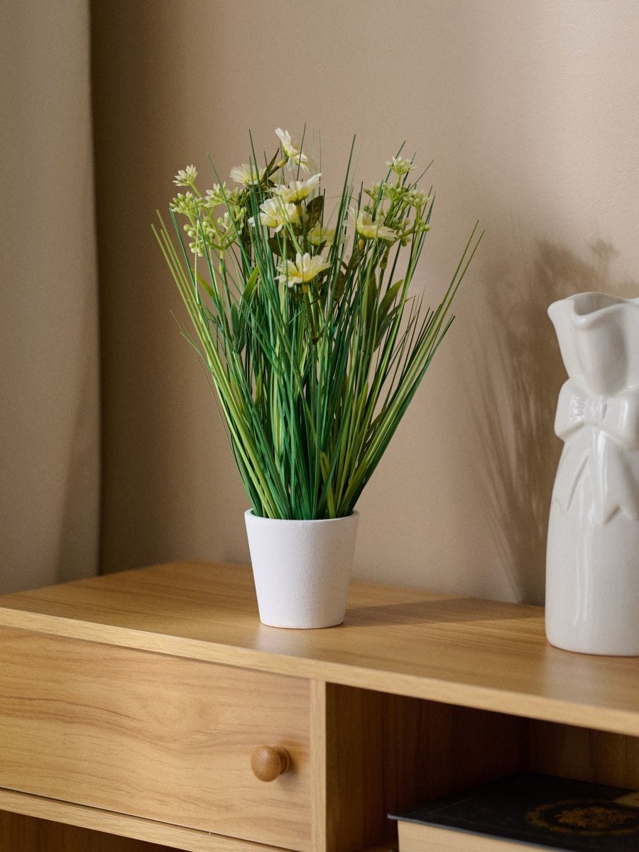 Roślina dekoracyjna w doniczce – trawa i stokrotki