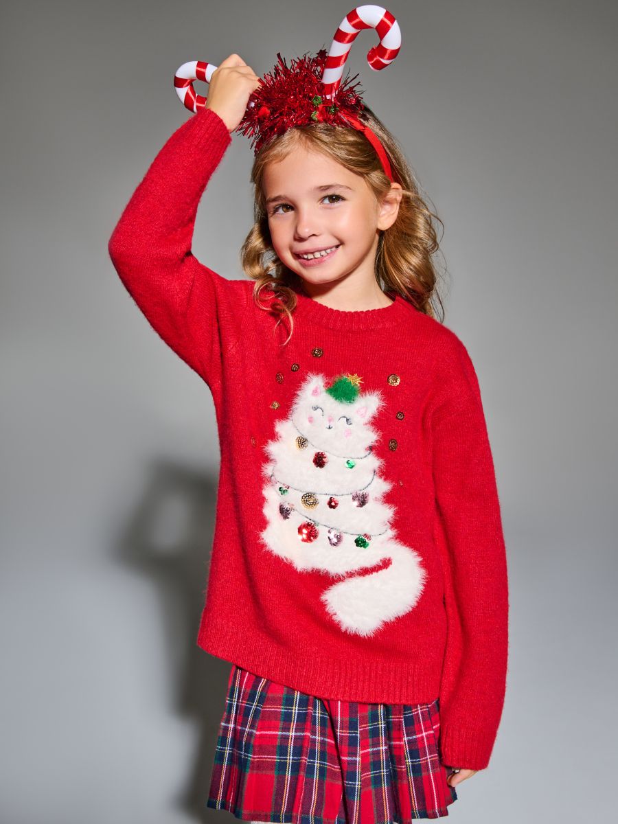 Świąteczny sweter z kotem ozdobionym cekinami