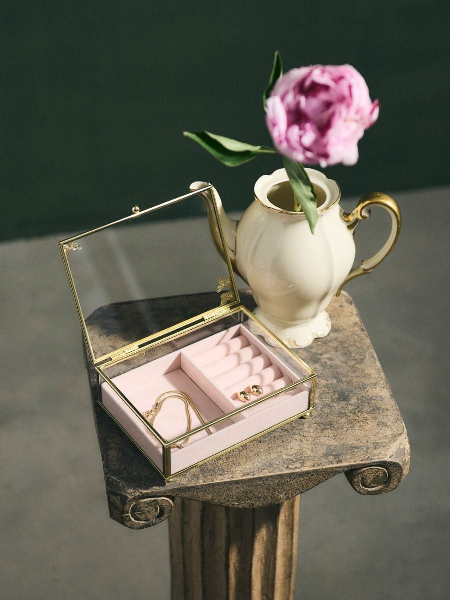 Szklany organizer na biżuterię ze złotymi detalami