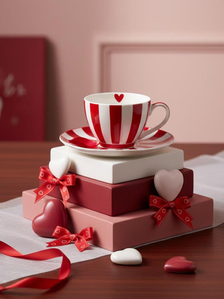 Walentynkowa filiżanka ceramiczna ze spodkiem w paski z sercem