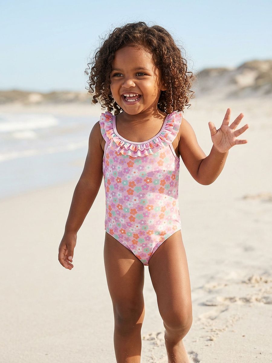 Costum de baie cu model floral și volan