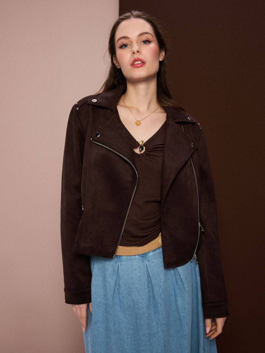Biker jakna od veštačkog brušenog antilopa sa dekorativnim nitnama