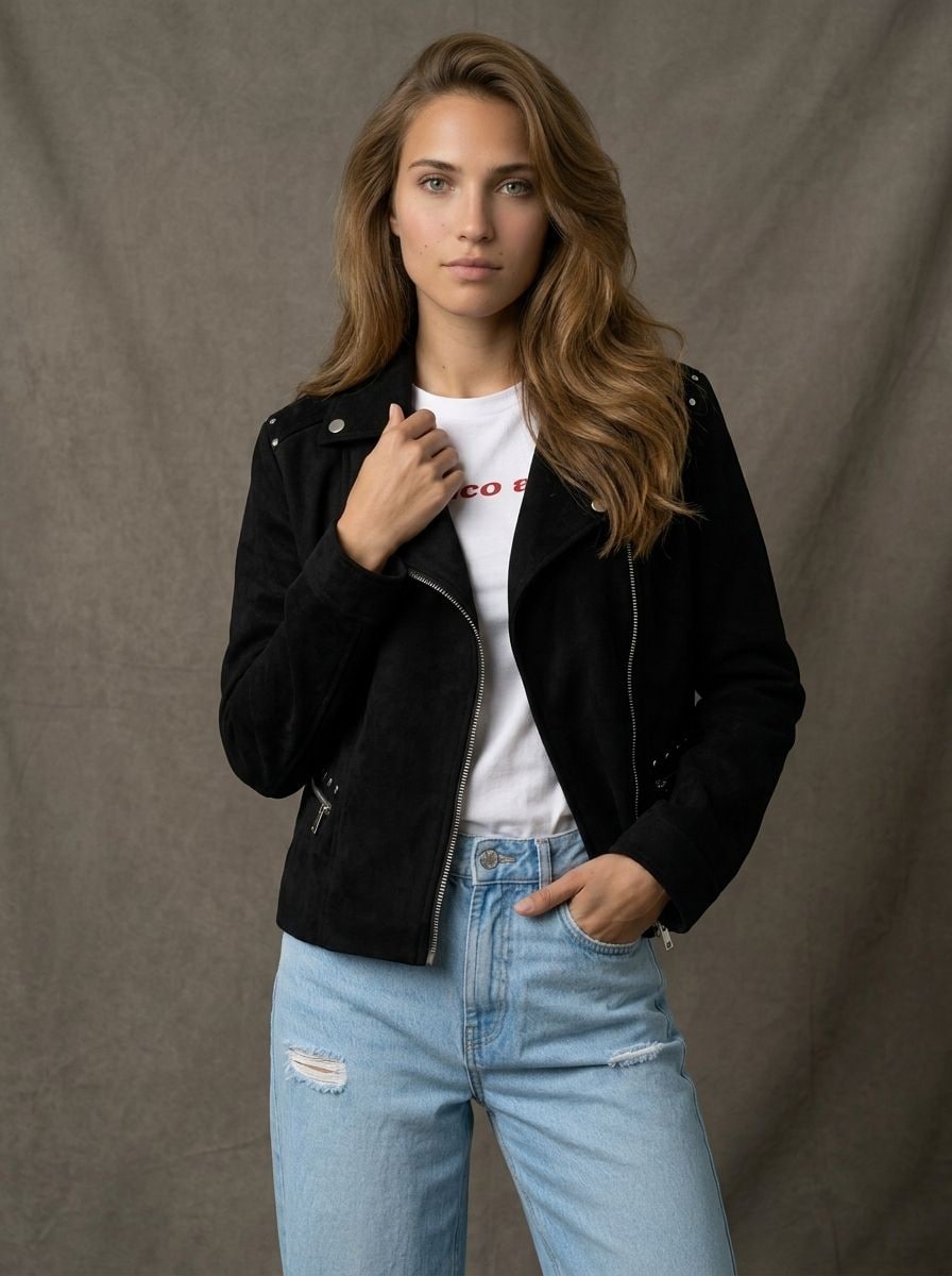 Biker jakna od veštačkog brušenog antilopa sa dekorativnim nitnama