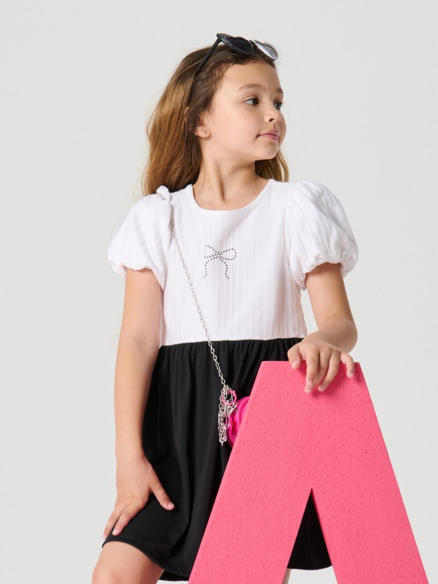 Dvobojna haljina sa puf rukavima i ukrasnom mašnom