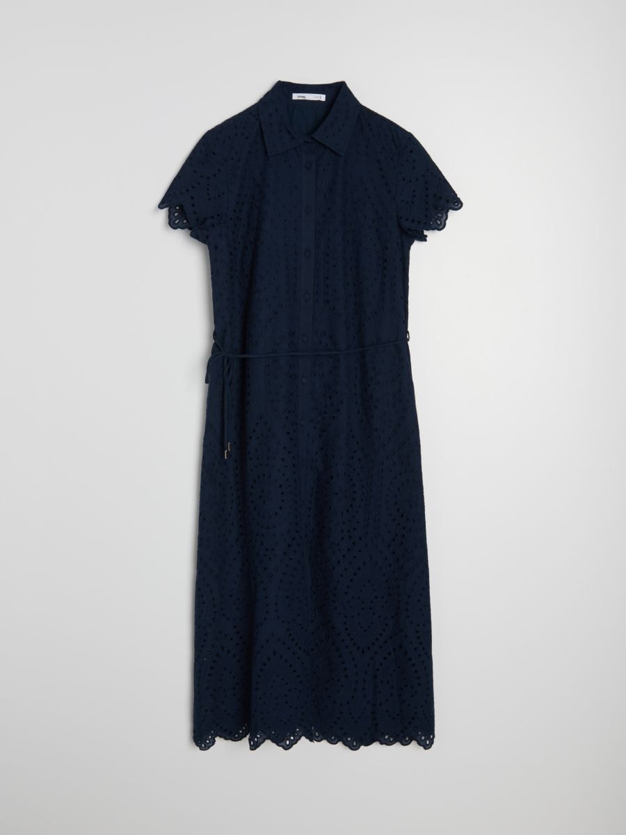 Bombažna midi obleka z ovratnikom in ajour vzorcem