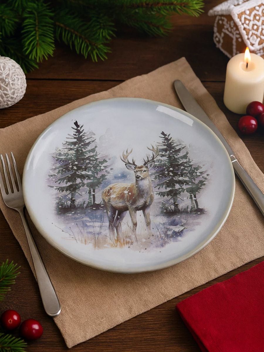 Božični krožnik z motivom severnega jelena v zimskem gozdu