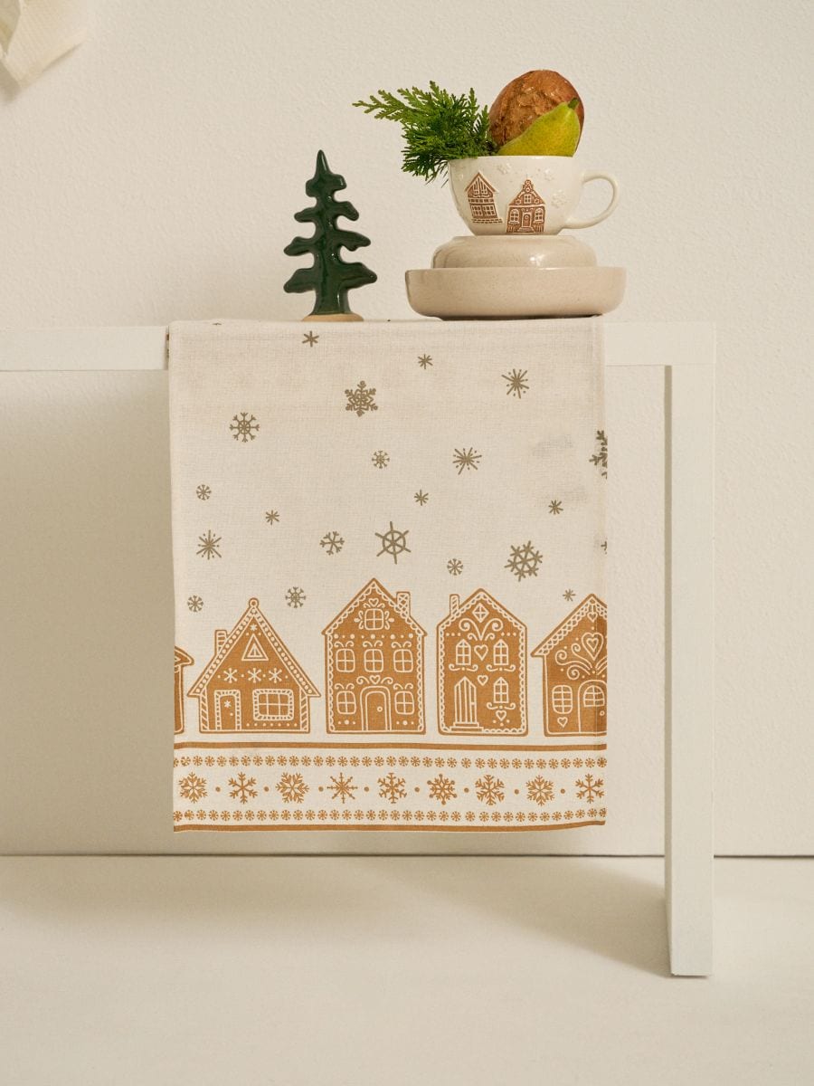 Božični prt s potiskom medenjakovih hišk