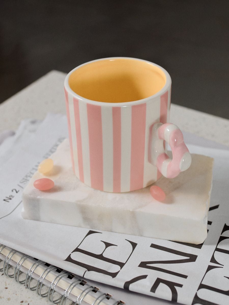 Keramična skodelica v črtah z okrasnim ročajem