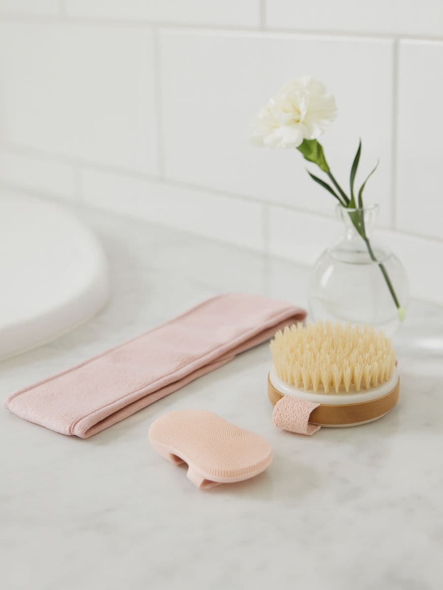 Kopalni set: trak za lase, krtačka za čiščenje obraza, krtača za umivanje