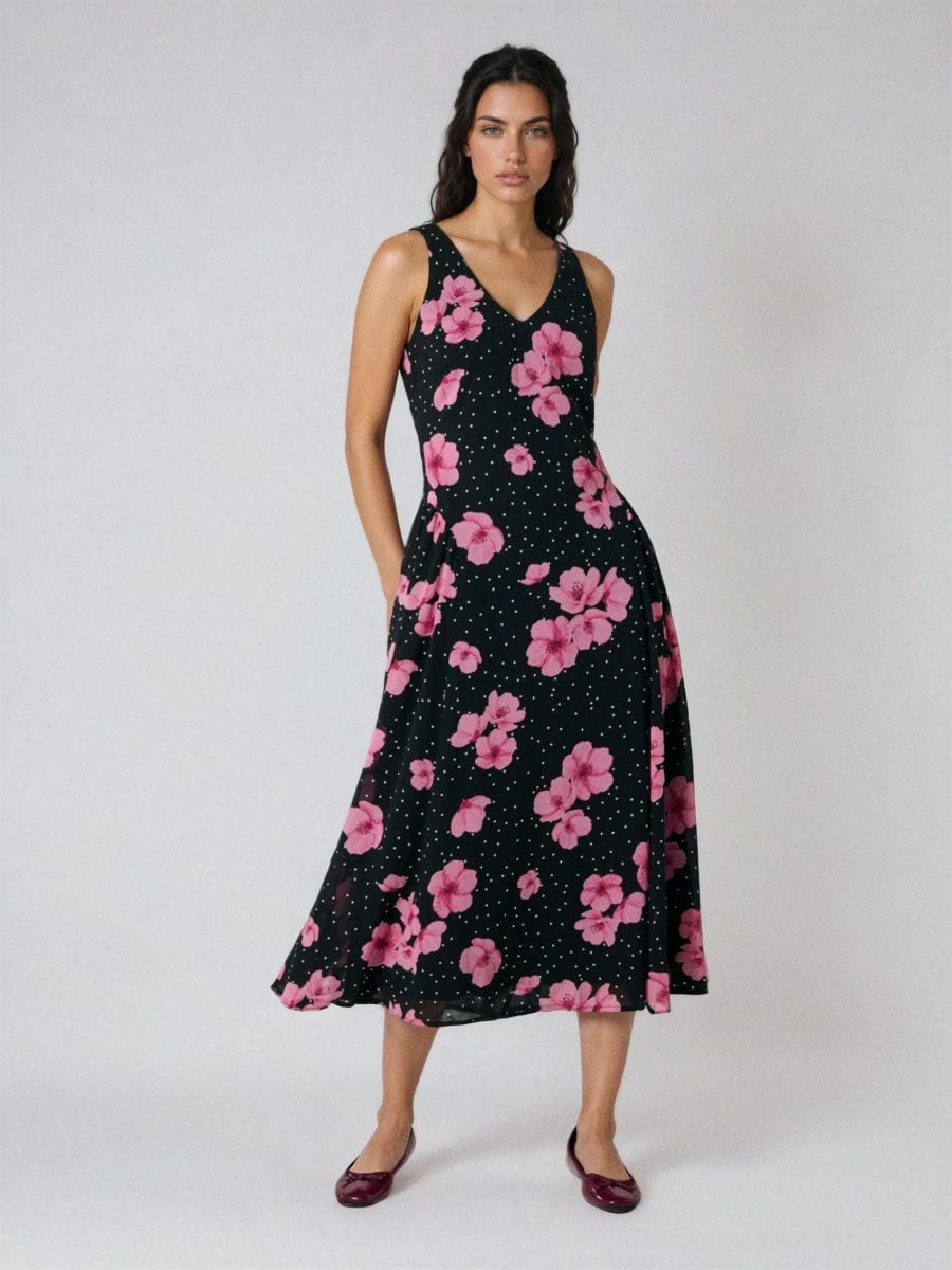 Midi obleka s pikami in cvetličnim potiskom