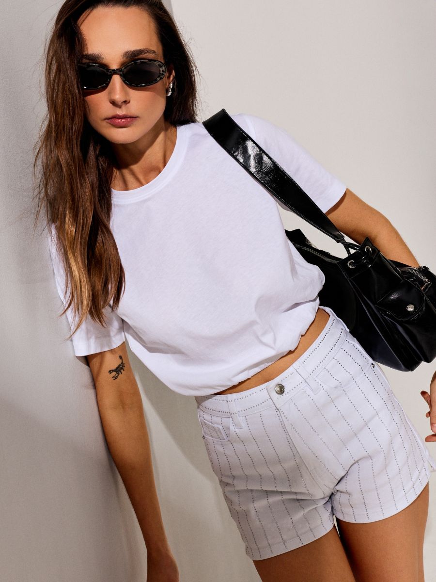 Mom denim kratke hlače z visokim pasom in zakovicami