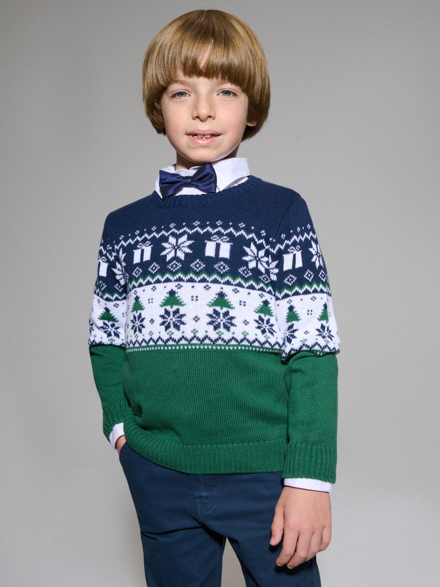 Praznični pulover s skandinavskim vzorcem, smrekami in darili