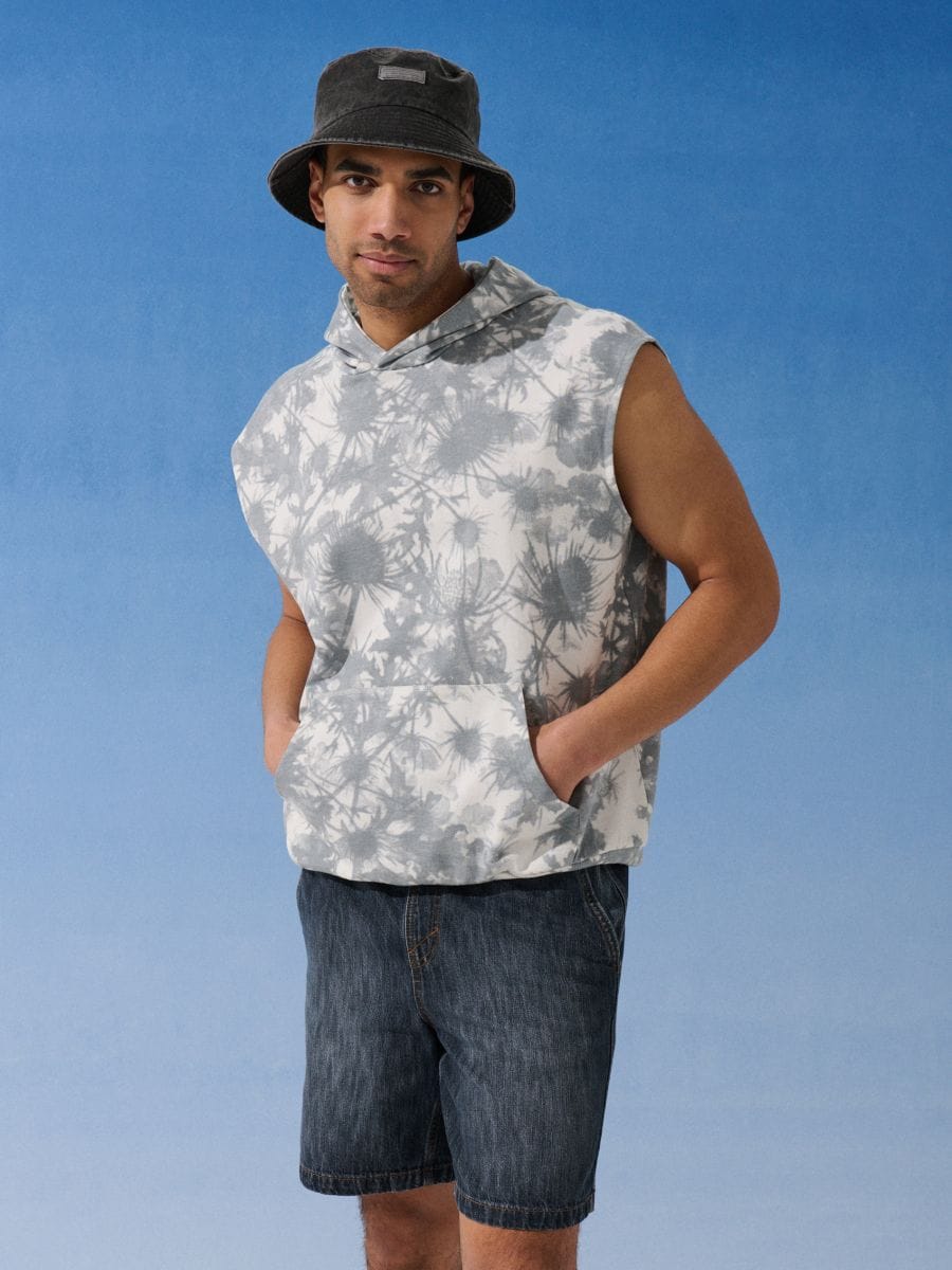 Pulover brez rokavov s kapuco z rastlinskim motivom
