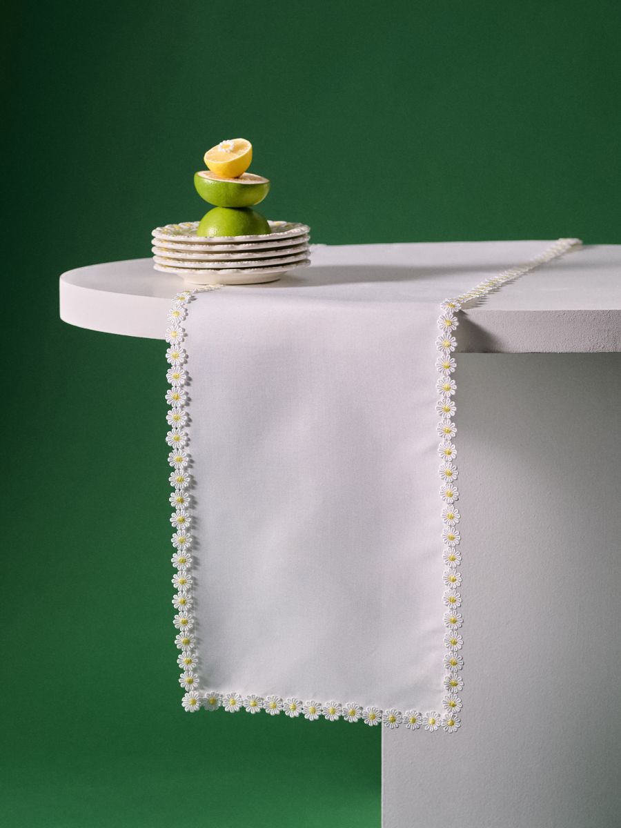 Spomladanski namizni tekač s čipkastim robom z marjeticami
