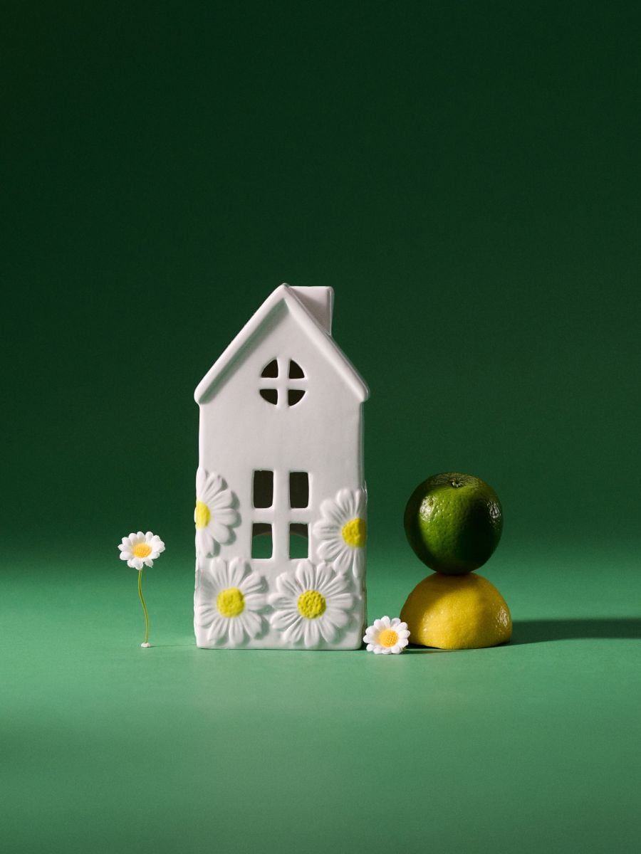 Svečnik v obliki hiše z motivom marjetic