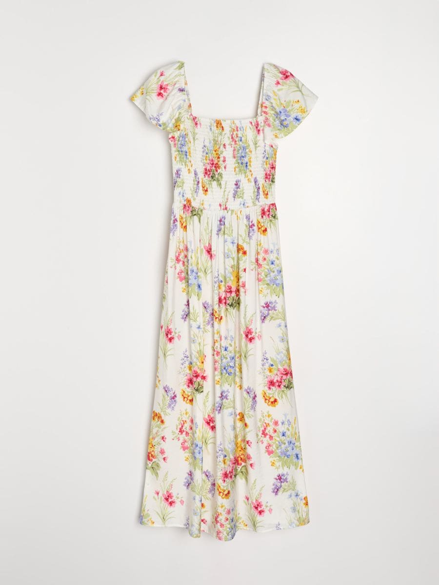 Viskozna midi obleka z naborki in cvetličnim vzorcem